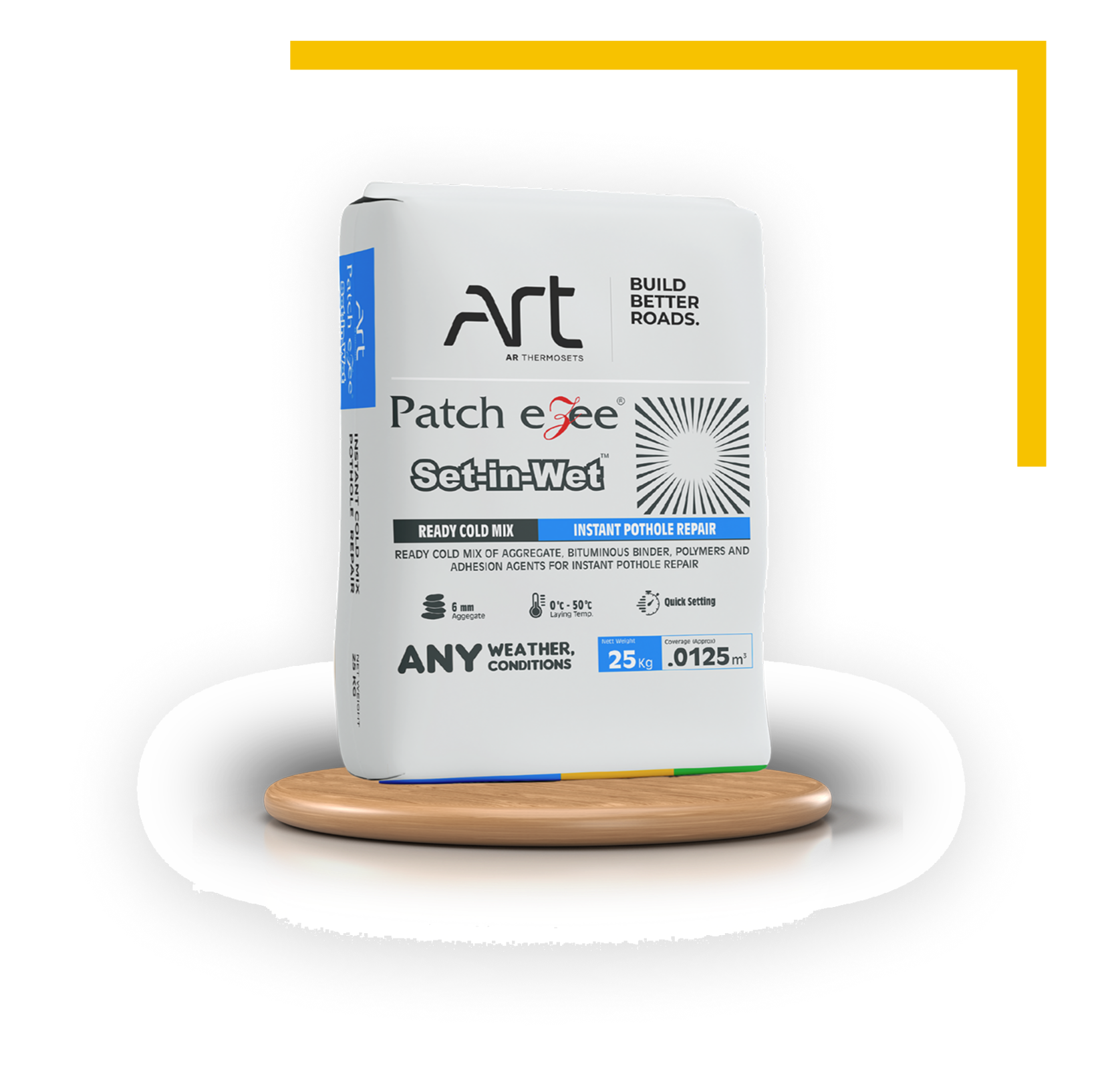 There are two variant available; PatchEzee® Set-in-Wet for Base Course Repairs and PatchEzee™ Set-in-Wet for Wearing Course Repairs. The materials are packed in 25kg (~0.0113cum.) bags and post compaction density is ~2.2 ton/cum.